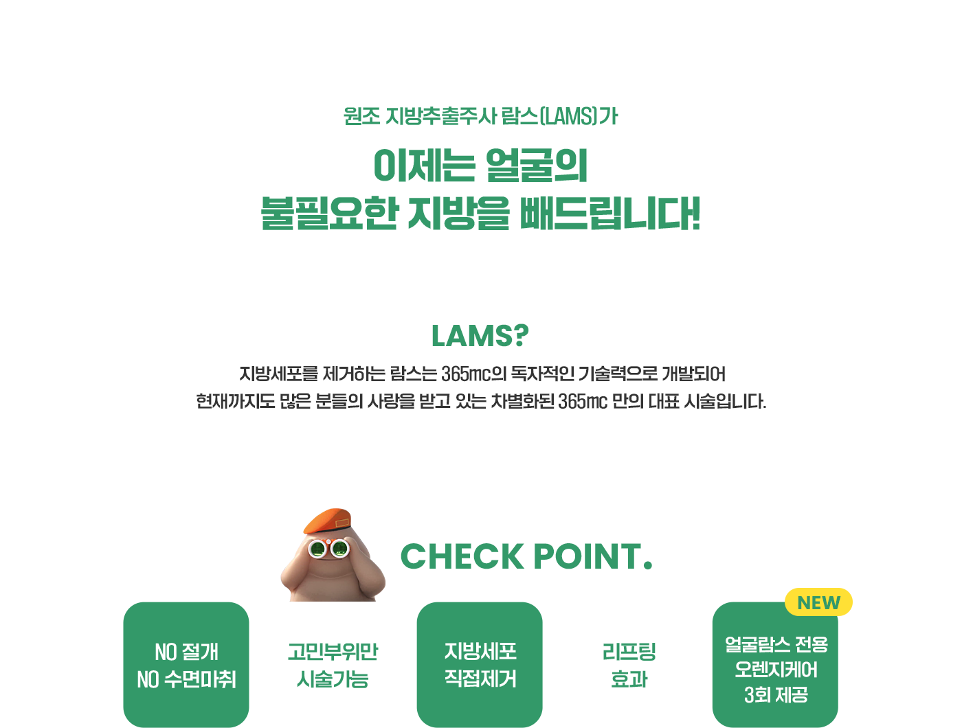 원조 지방추출주사 람스(LAMS)가 이제는 얼굴의 불필요한 지방을 빼드립니다! Lams? 지방세포를 제거하는 람스는 365mc의 독자적인 기술력으로 개발되어 현재까지도 많은 분들의 사랑을 받고 있는 차별화된 365mc 만의 대표 시술입니다. CHECK POINT. 절개NO 수면마취NO 고민부위만시술가능 지방세포직접제거 리프팅효과
